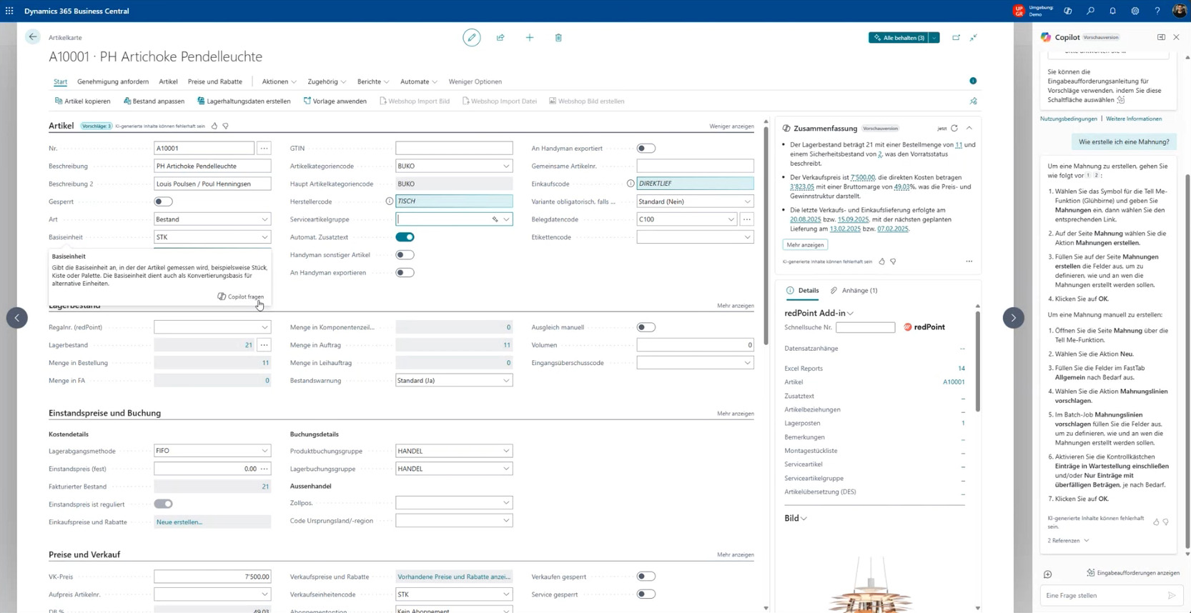 Beim Öffnen von Debitoren, Kreditoren oder Artikeln erstellt Copilot automatisch eine kompakte Zusammenfassung: aktueller Lagerbestand, offene Bestellungen, Einstandspreis, letzter Verkaufspreis oder vergangene Lieferungen. Ohne zusätzliche Klicks sieht man sofort die wichtigsten Kennzahlen.