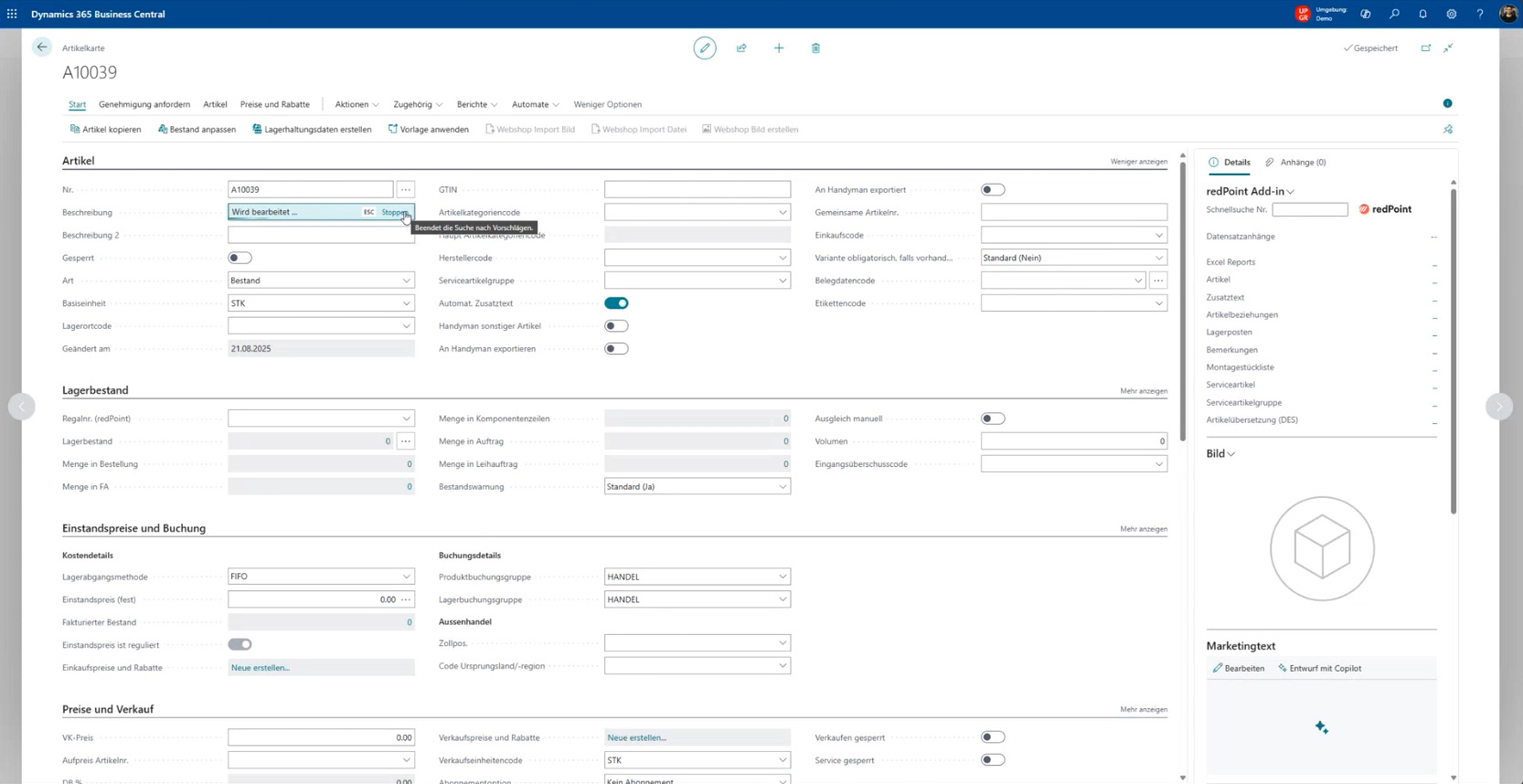 Die Funktion der automatischen Feldwert-Vorschläge beim Erstellen neuer Artikel kann eine Entlastung sein, allerdings springe ich hier nicht vor Euphorie im Raum umher. Die generierten Marketingtexte bieten schon eher einen Mehrwert. Vor allem für jene Personen, denen das Schreiben nicht sonderlich liegt. Die Qualität steht und fällt mit der Datenqualität der Artikelkarte selbst.