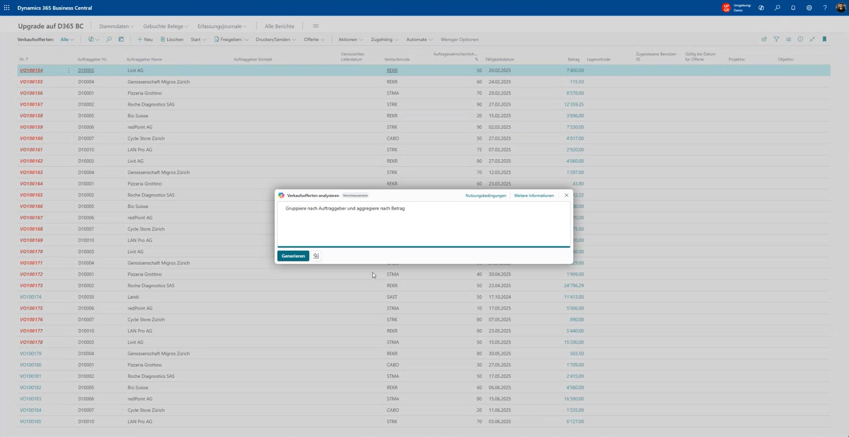 Mit Copilot können in Dynamics 365 BC rasch und mit geringstem Aufwand Analyseberichte erstellt werden. Es reicht ein Prompt: «Gruppiere Offerten nach Auftraggeber und summiere die Beträge». Sofort erstellt das System eine Analyseliste, die sich durch Folgeprompts weiter eingrenzen lässt, etwa auf Offerten über 10’000 Franken mit einer Abschlusswahrscheinlichkeit über 80%.