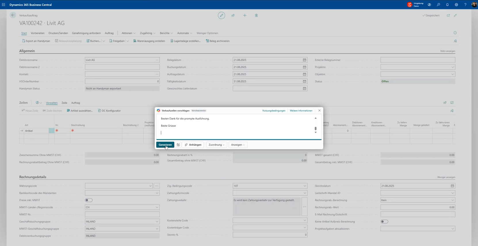 Ein besonders greifbares Beispiel: Eine Bestellung trifft als Freitext-E-Mail ein. Statt die Positionen manuell zu erfassen, wird der Text kopiert, in Copilot eingefügt – und die KI erkennt die Artikel und Mengen. Noch schneller geht es bei wiederkehrenden Bestellungen: Mit einem Dropdown lässt sich die letzte Rechnung übernehmen und bei Bedarf anpassen.